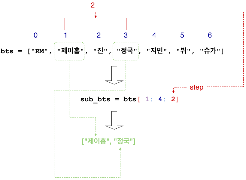 위에 처럼 step을 2로 선언하면 sub_bts 의 값은