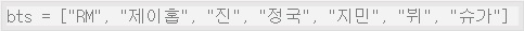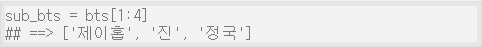 이제 여기서 bts 의 2번째 요소 부터 4번째 요소만 따로 copy해서 sub_bts 라는 list를 만들고자 한다면 다음 처럼 할 수 있습니다.