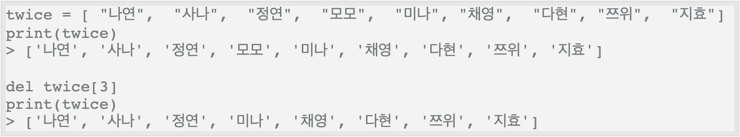 del 키워드는 list에서 원하는 요소를 삭제할수 있게 해준다. 하지만 요소가 리스트에서 삭제되면 파이썬이 자동으로 리스트의 인덱스들을 다시 정렬해서 인덱스 번호가 중간에 비어있지 않도록 하게 해줍니다.