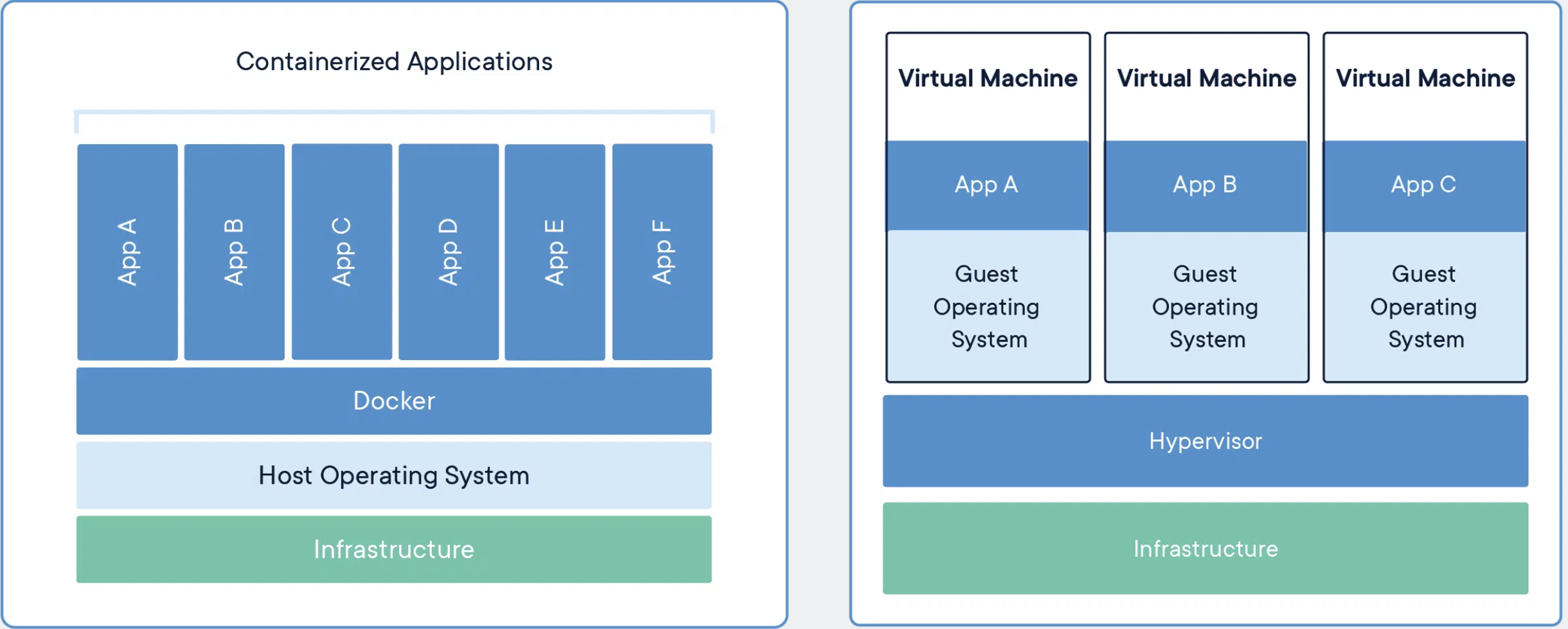 아래 그림은 도커(왼쪽)와 기존의 가상화 방식(오른쪽)을 나타낸 것이다.
