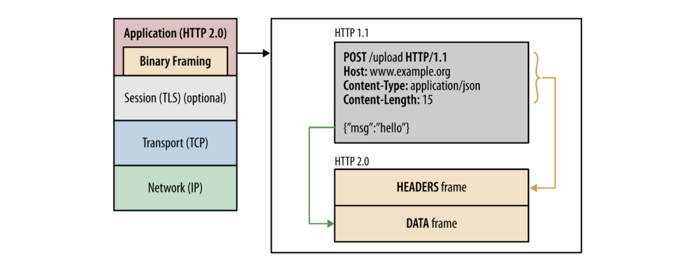 HTTP 1.1에서는 메시지가 text로 전송되었던과는 달리 HTTP 2.0에서는 binray frame으로 인코딩되어 전송된다는 점이다.