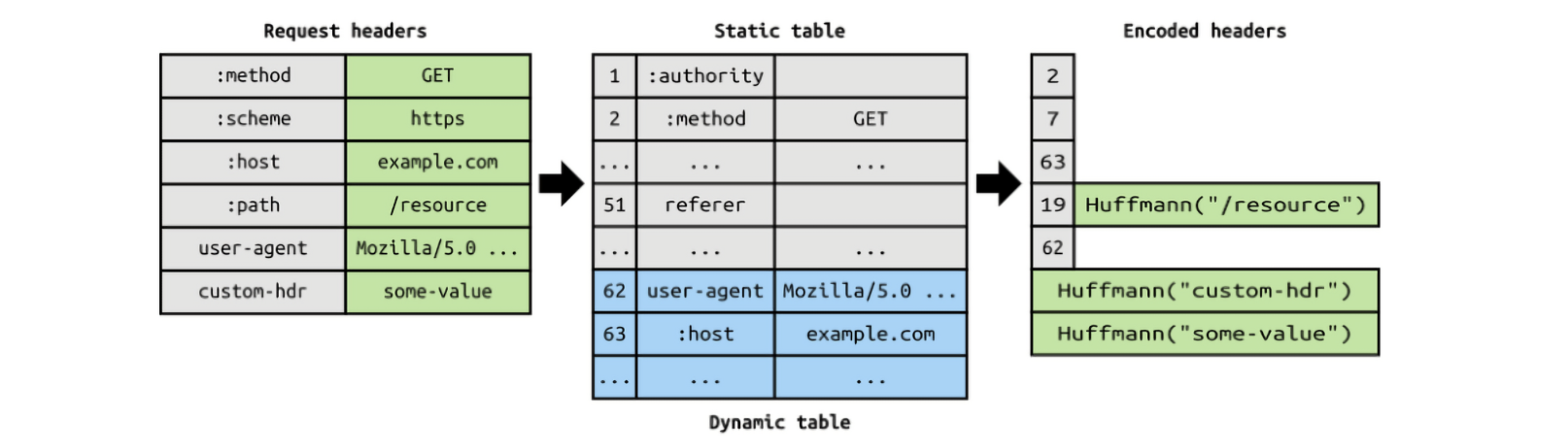 만약 메시지 헤더에 중복값이 존재하는 경우, 위 그림에서 Static / Dynamic table 개념을 사용하여 중복 헤더를 검출하고, 중복된 헤더는 index값만 전송하고 중복되지 않은 Header 정보의 값은 호프만 인코딩 알고리즘을 사용하는 HPACK 압축 방식으로 인코딩 처리 하여 전송하여, 데이터 전송 효율을 높였다고 보면 된다.