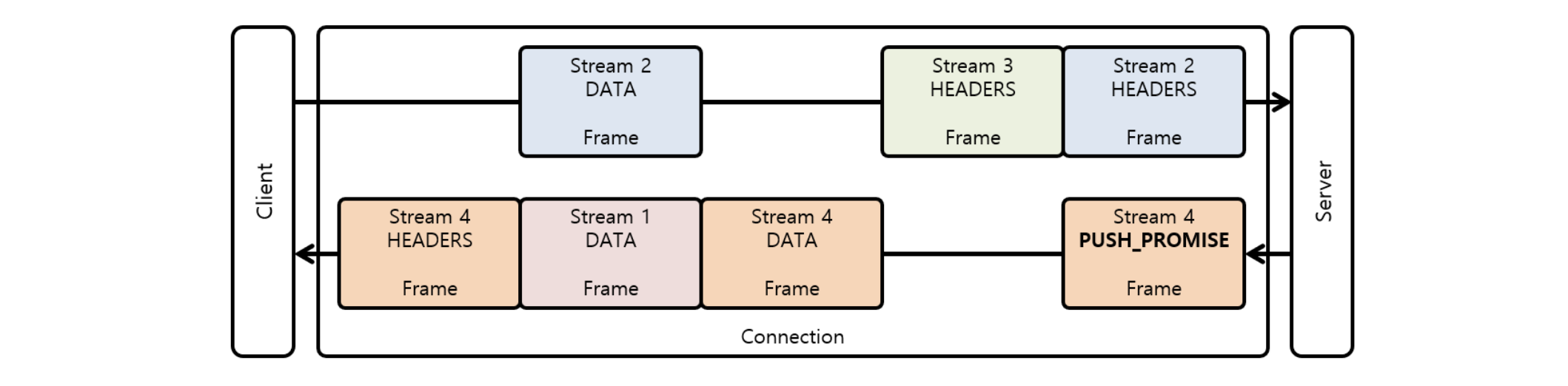 이처럼 프레임 단위로 이루어진 요청과 응답 메시지는 하나의 스트림을 통해 이루어지며, 이런 스트림들이 하나의 커넥션에서 병렬적으로 처리되기 때문에 성능이 향상된다.