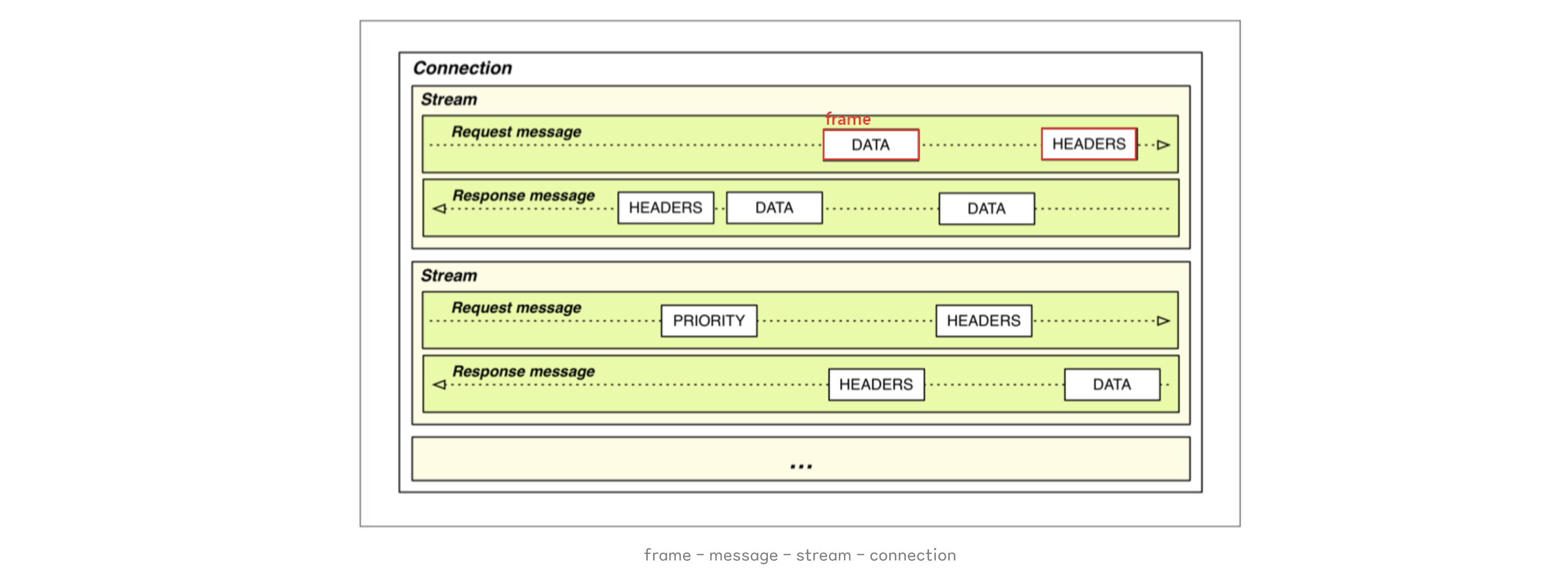 그리고 Message는 특정 Stream에 속하게 되고, 여러개의 Stream은 하나의 Connection에 속하게 된다.