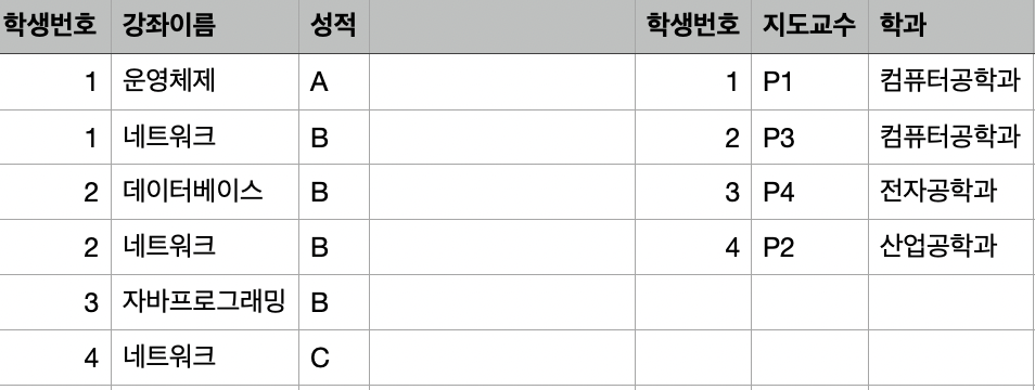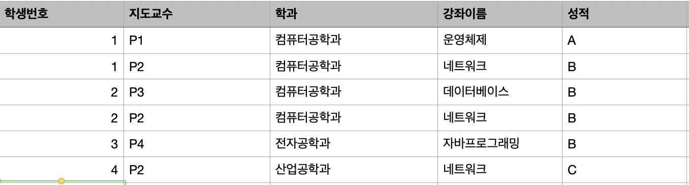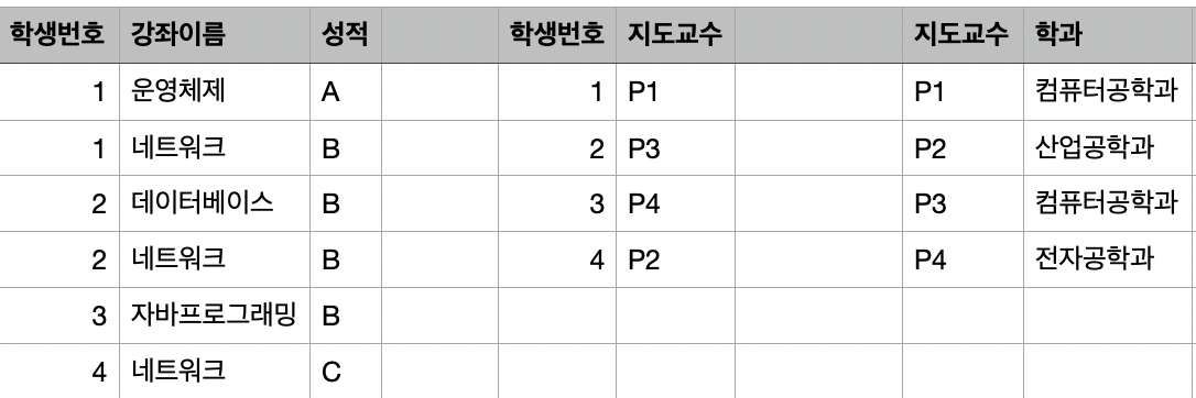 따라서 지도 교수의 학과를 추가하기 위해서 학생 번호까지 필요하게 되고, 학생이 자퇴하였는데 지도 교수의 학과 정보가 사라진다는 문제점이 있다.