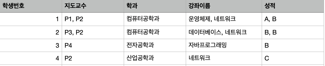 위 테이블은 1, 2번 학생이 여러 개의 강의를 가지고 있기 때문에 제 1 정규화에 위배된다.