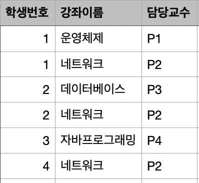 아래와 같이 수강 강좌 테이블이 있다고 가정해보자.