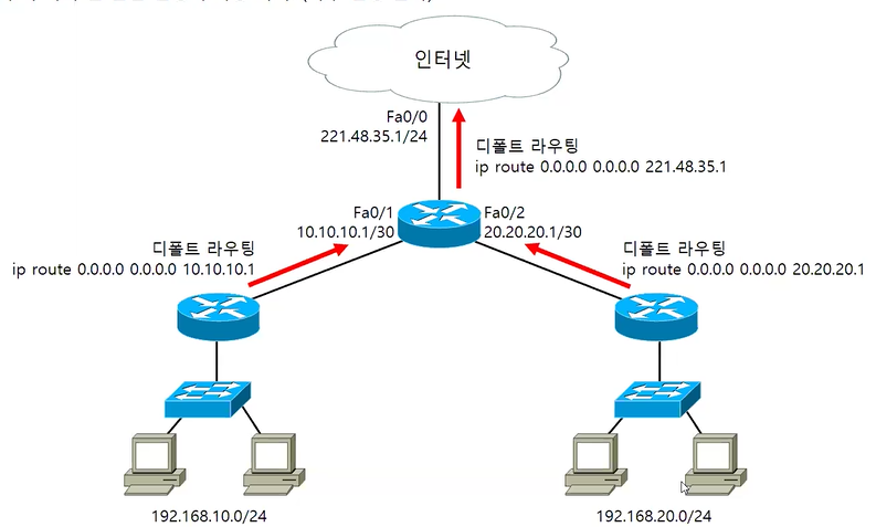 - 인터넷과 연결되는 라우터에는 대부분 디폴트 라우팅이 설정되어 있음