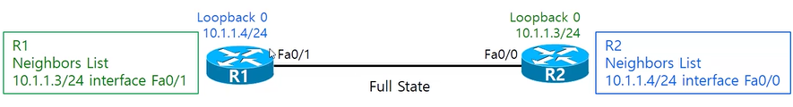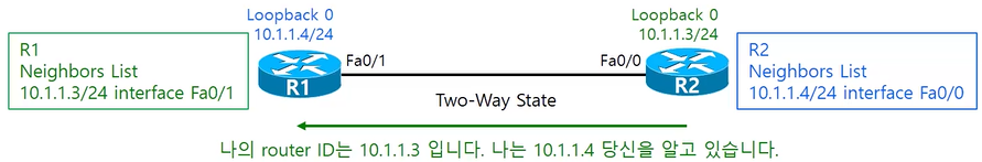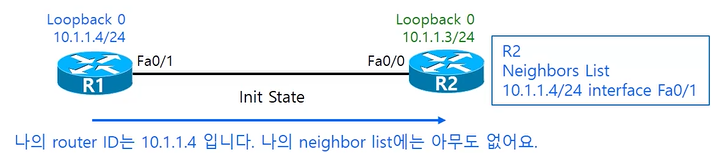 - R1은 R2가 보낸 Hello massage를 통해 R2의 Router ID 를 Neighbor List로 등록