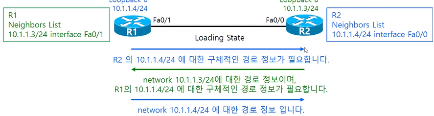 - 라우터 간에 LSA 헤더를 주고 받아 경로 정보에 대한 요청이 끝나면 구체적인 정보를 주고 받는다