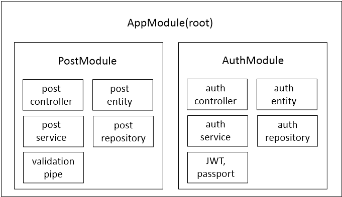 각 응용프로그램은 root module인 Application Module은 기본적으로 가지고 있고, root module은 Nest가 module과 provider의 관계, 종속성 등을 다루는 시작점이 된다.
