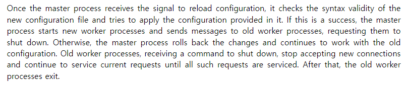 NGINX 공식문서를 보면 nginx -s reload 명령을 입력하면 일어나는 일은 다음과 같다.