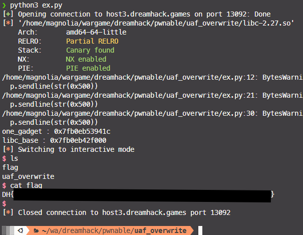 그리고 마지막으로 fptr을 실행하여 oneshot gadget을 실행하면 셸을 획득 할 수 있다.