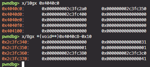 book0.title의 버퍼를 끝까지 채우고 다음 청크의 prev_size를 덮는다. 그리고 boo1 struct 청크의 size 필드를 정상으로 유지하고 book1.no와 book1.price에 각각 1을 넣는다. 그리고 book1.author에 books[3]의 주소를 넣고 book1.title에는 books[6] 근처의 쓰기 가능한 영역의 주소를 넣는다.