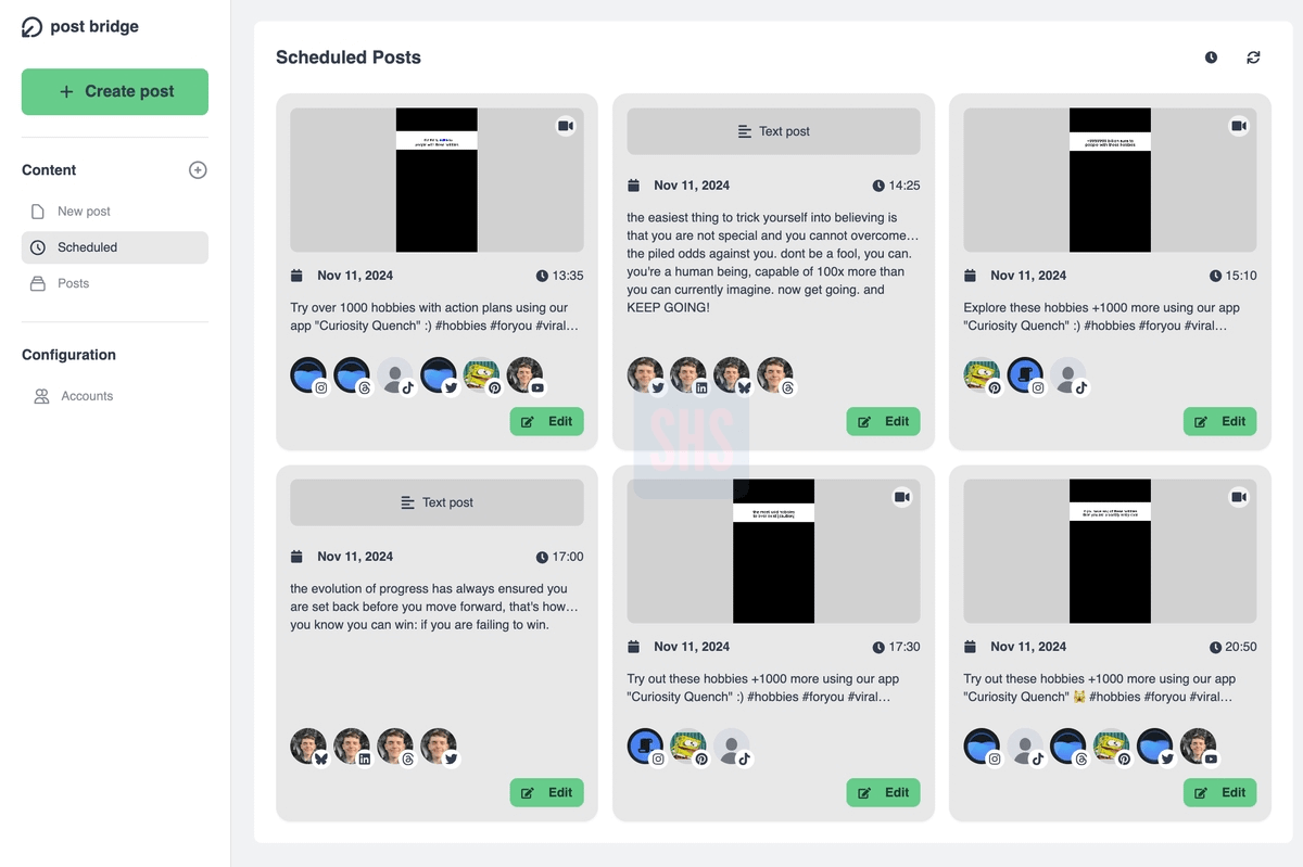 post-bridge.com ์ SNS ์ปจํ ์ธ ๊ด๋ฆฌ SaaS ์ ๋๋ค. ๋๋ต ์๋์ ๊ฐ์ ๊ธฐ๋ฅ๋ค์ด ์์ต๋๋ค.