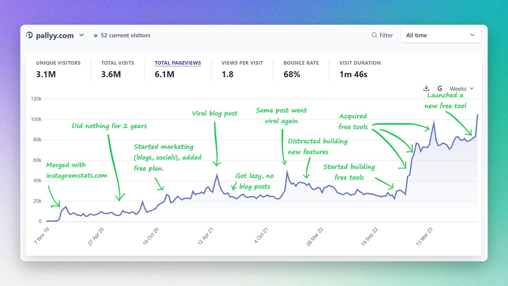 Tim์ Pallyy.com์ผ๋ก ํผ๋ฒํ๊ณ ๋ง์ผํ ์ ์์ํ ์์ ๋ถํฐ Audience๊ฐ ์๋ SEO์ ์ง์คํ์ต๋๋ค. ๊ทธ ๊ฒฐ๊ณผ ํธ์ํฐ ํ๋ก์ ๊ฐ์ Audience ์์ด๋ Pallyy.com์ ์ถฉ๋ถํ ํธ๋ํฝ์ ์ป๊ณ ์์ต๋๋ค.