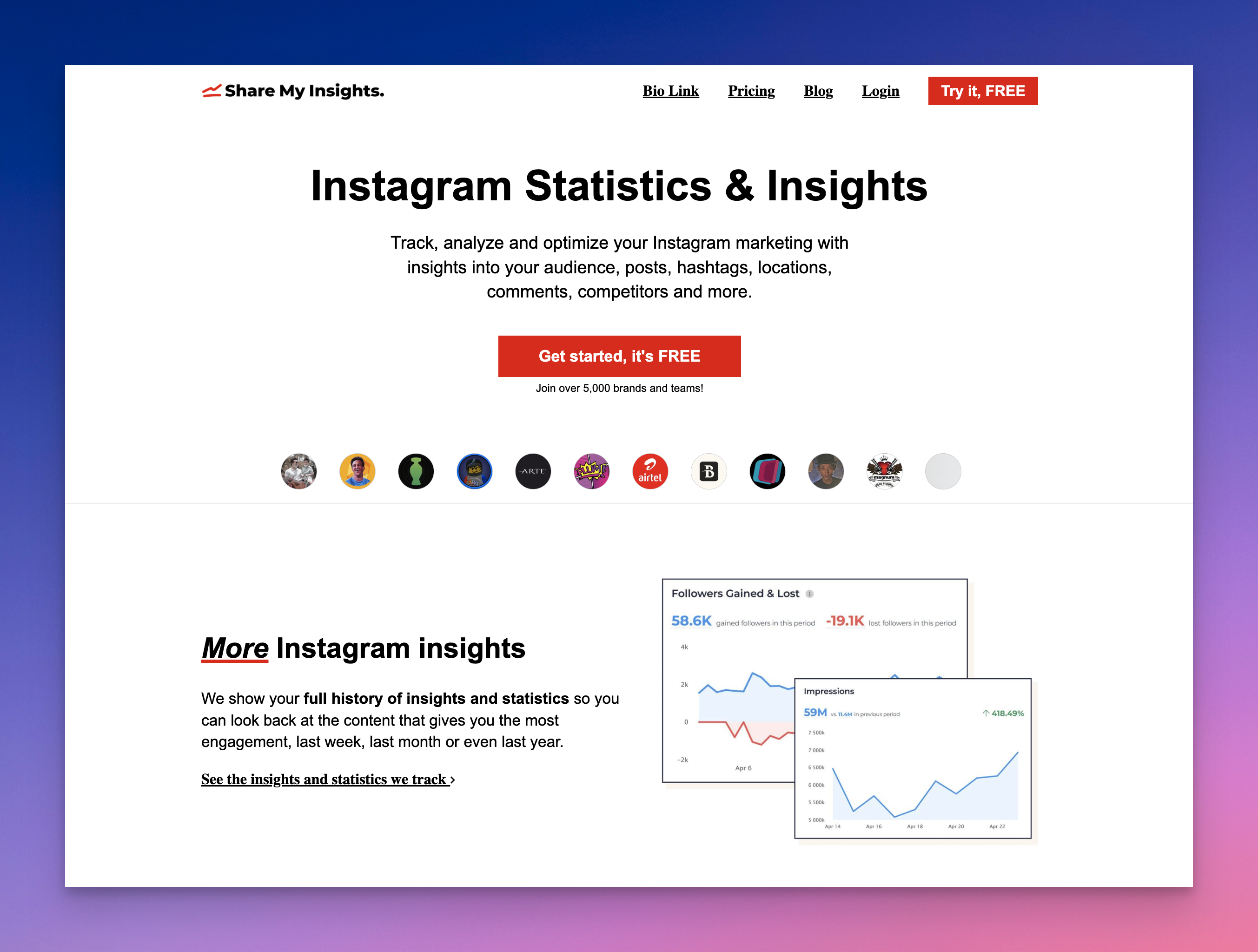 Tim์ด ๊ฐ๋ฐ์ ๋ ํํ๊ณ ์ฒ์ ๋ง๋ค๊ธฐ ์์ํ ์๋น์ค๋ ์ธ์คํ๊ทธ๋จ ๊ณ์ ์ ํต๊ณ ๋ฐ์ดํฐ๋ฅผ ํ์ธํ๊ณ ๊ณต์ ํ ์ ์๋ ์๋น์ค์ธ ShareMyInsights.com์ ๋๋ค.