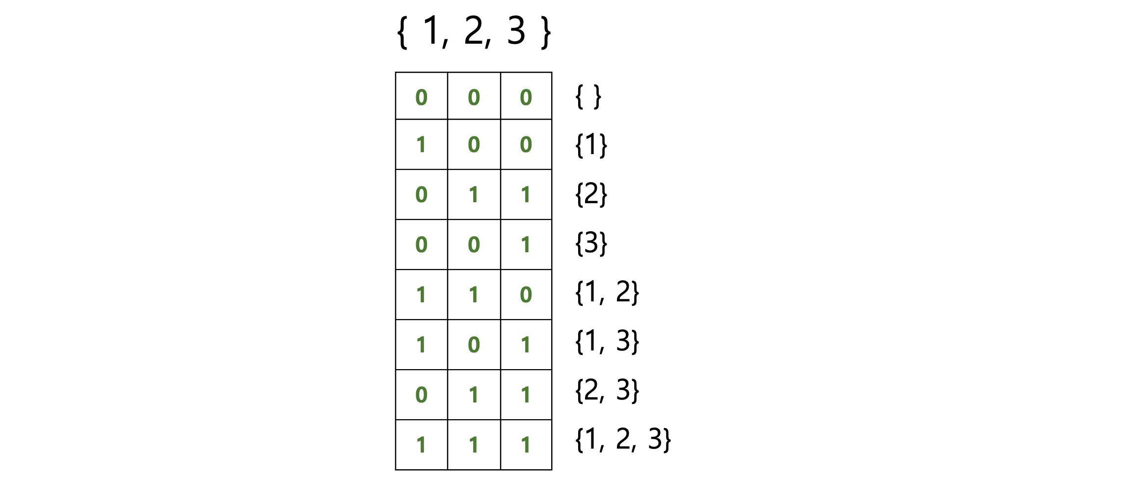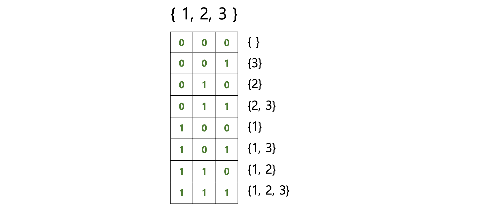 int[] nums = {1, 2, 3} 의 모든 부분집합을 구하고 부분집합에 원소가 속해있으면 1, 속하지 않는다면 0을 표시해 보았습니다.