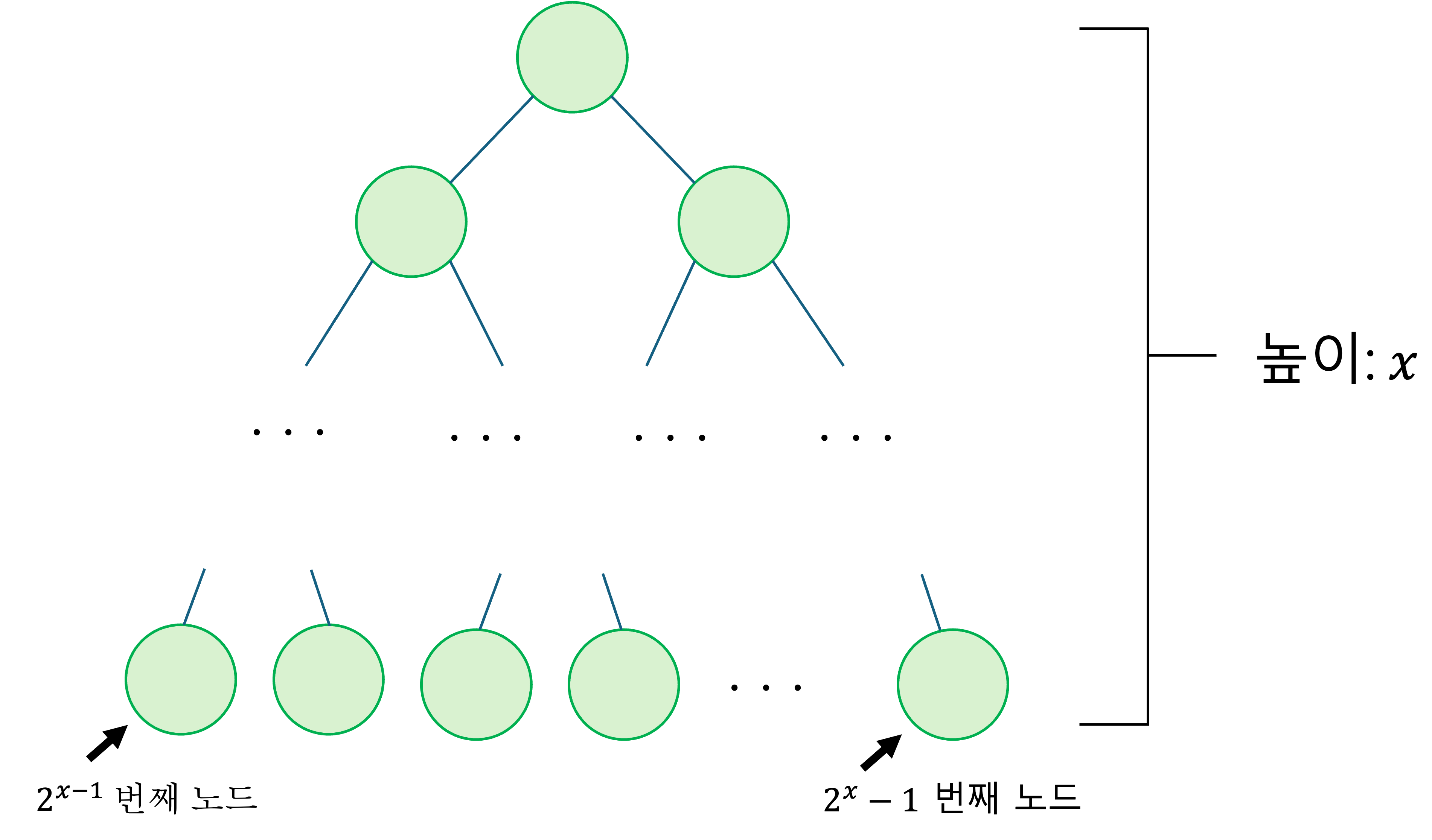 노드 개수를 이라 할 때, 완전 이진 트리에서 와 의 관계는 다음과 같습니다.