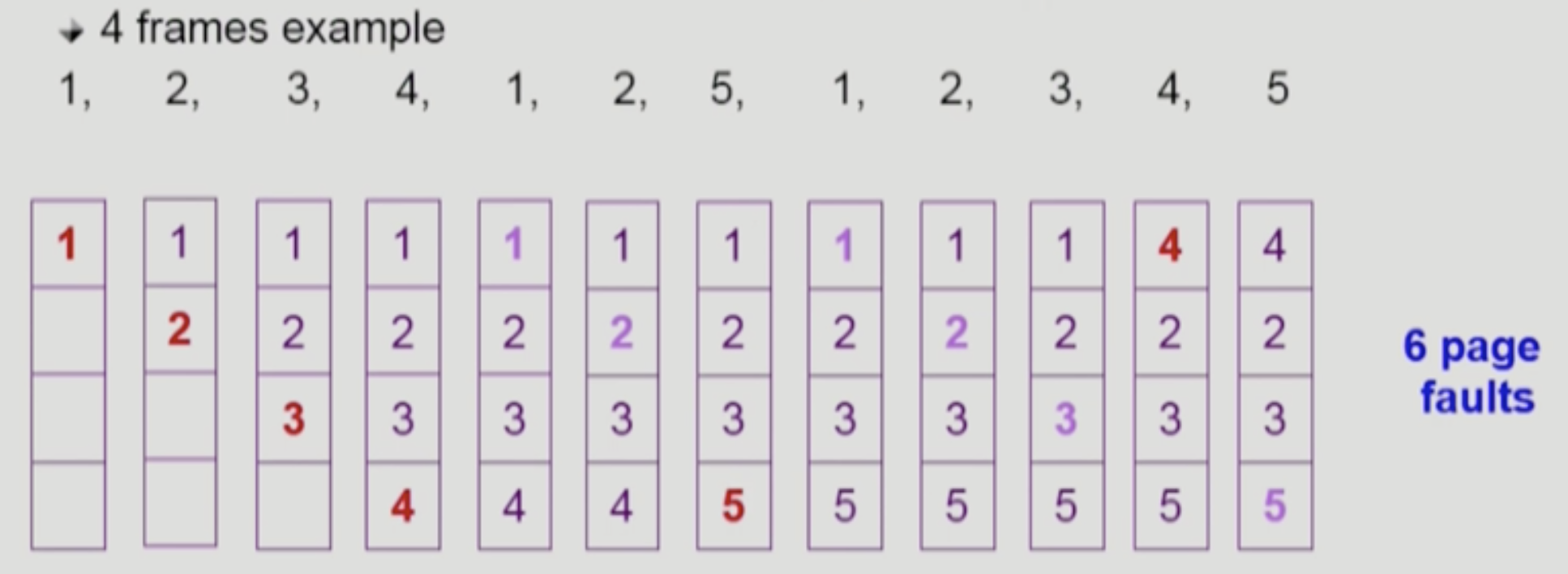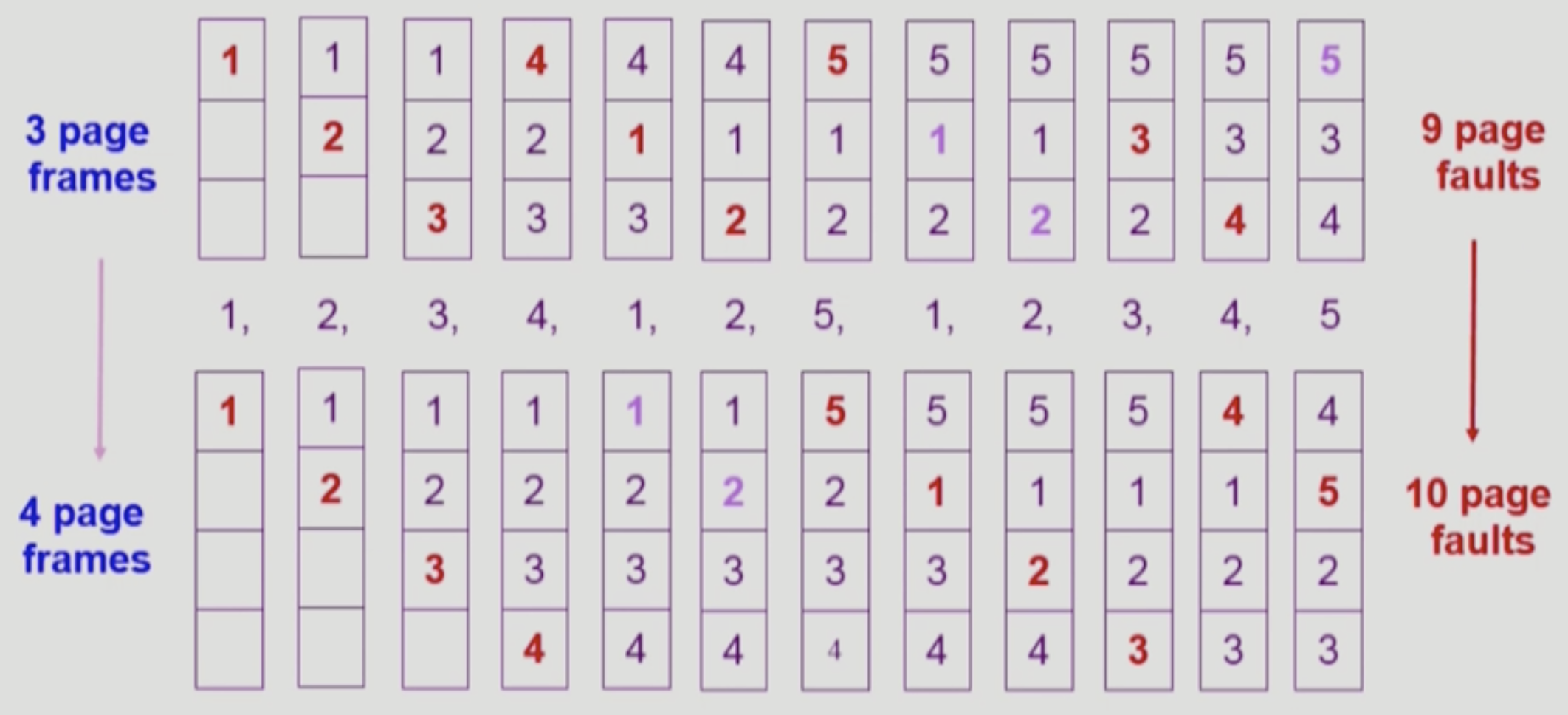 메모리를 더 할당해서 더 많은 페이지 프레임을 가지게 했을 때, 상식적으론 페이지 폴트가 덜 나야하겠지만, 해당 알고리듬에선 더 많아진다.