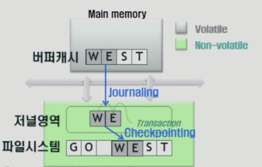 저널링: 5~30초 단위로 버퍼캐시에 수정된 내용을 디스크 상의 저널영역에 기록