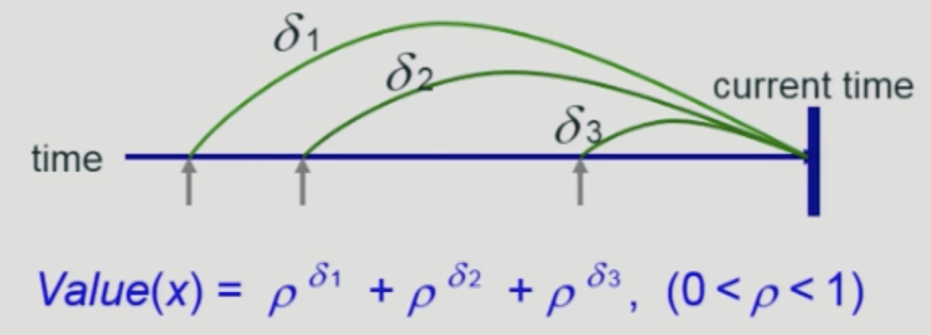 최근 참조일수록 블록의 가치 평가에 대한 기여도가 큼.