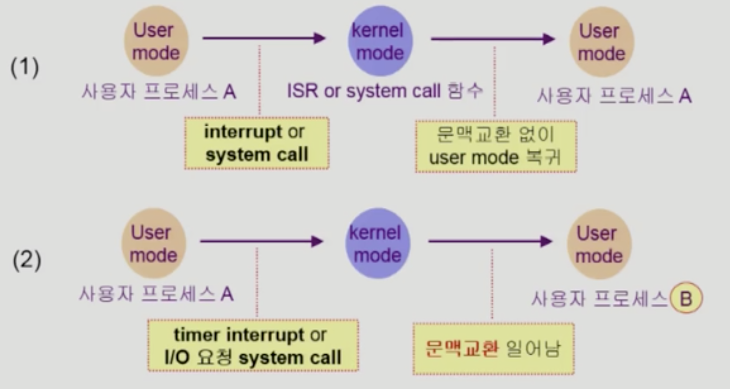 (1)의 경우에도 CPU 수행 정보 등 context의 일부를 PCB에 save(CPU 레지스터 값 등)해야 하지만 문맥교환을 하는 (2)의 경우 그 부담이 훨씬 큼 모든 context 관련 정보를 저장해야함.