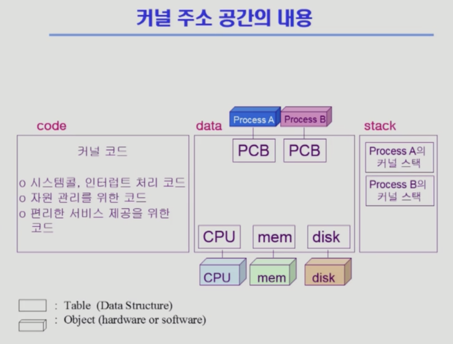 PCB : 프로세스를 다루기 위해 존재.사용자 정의 함수, 라이브러리 함수는 프로세스의 address space 상에 존재.