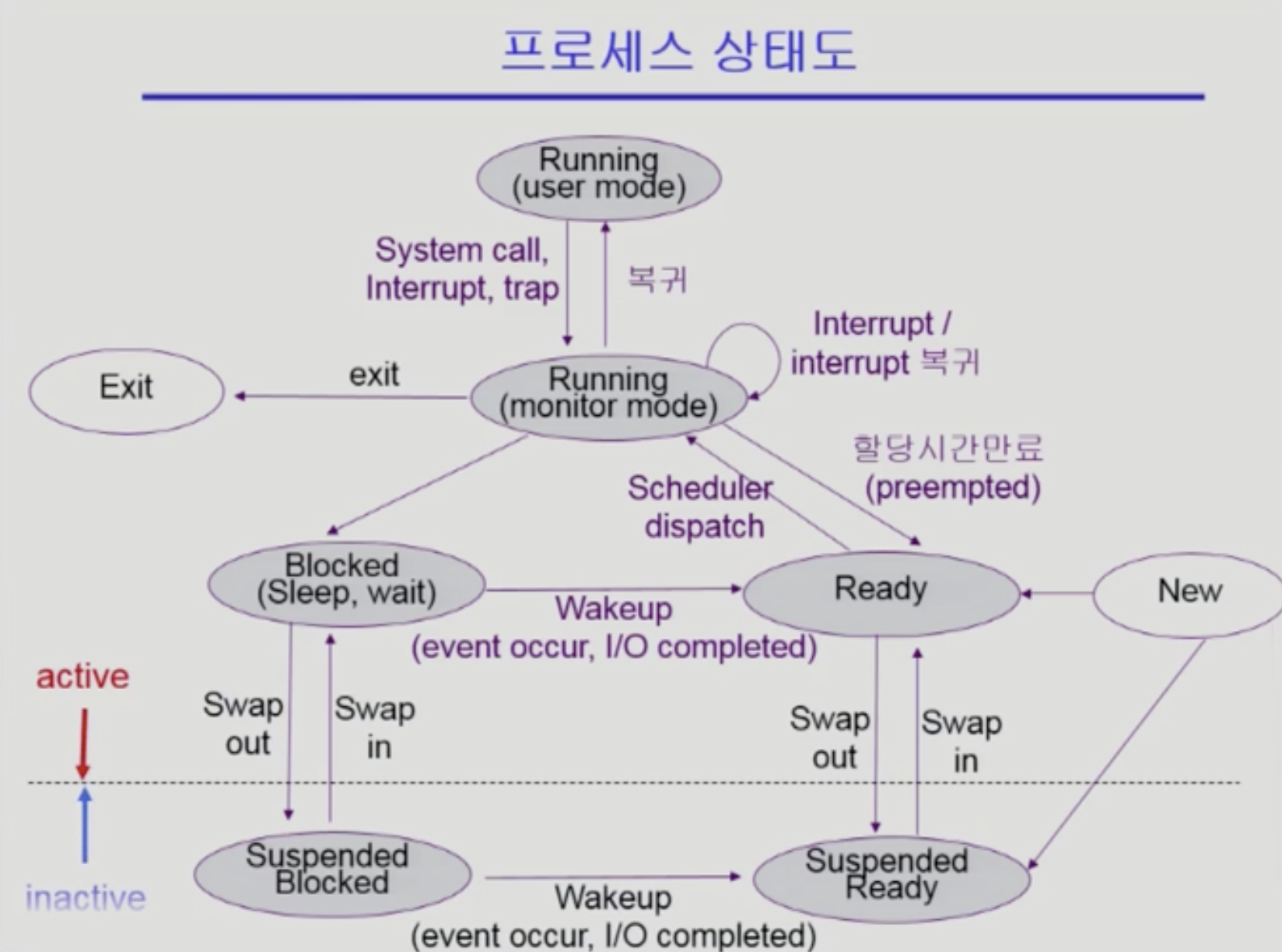 : 외부적인 이유로 프로세스의 수행이 정지된 상태