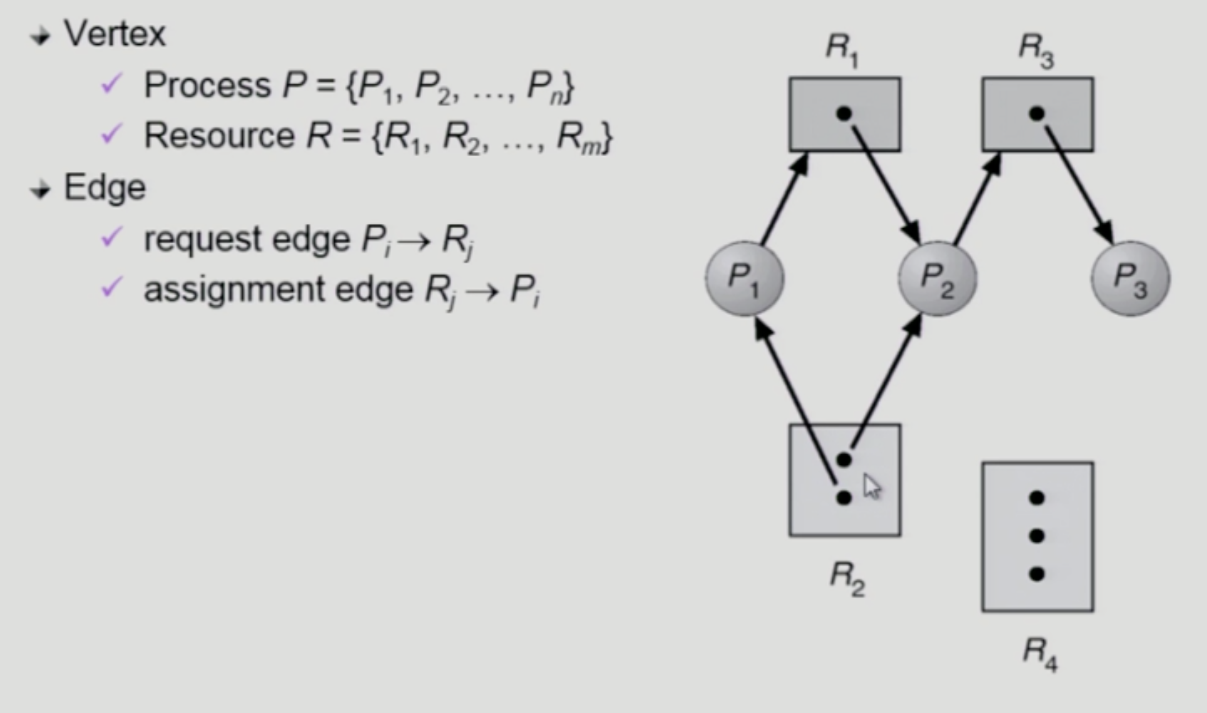 2. 공유 자원의 갯수가 여러개인 경우, 데드락이 발생할 가능성이 존재. -> 자원들이 모두 사이클에 기여하고 있어야 데드락.