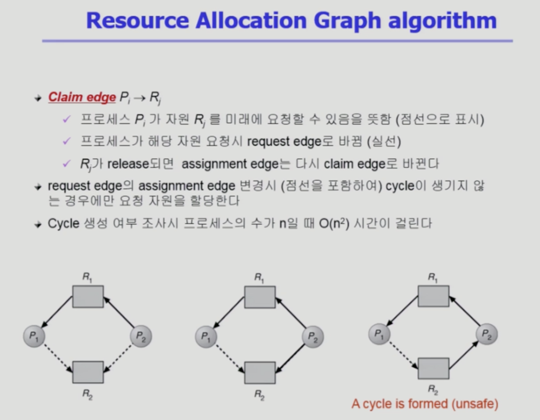 점선은 미래에 해당 자원을 요청할 수 있음을 나타내는데, 이를 통해 점선으로라도, 사이클이 형성되어 데드락이 발생할 수 있다면 자원을 할당하지 않는 것이 Deadlock Avoidance.