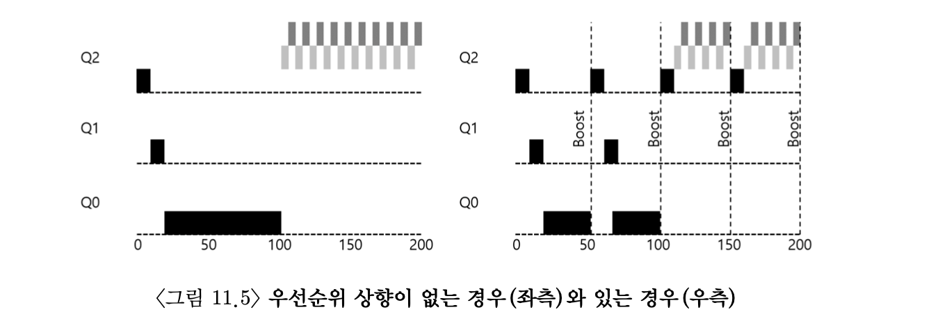 - 긴 작업이 낮은 우선순위 큐에 머물러 실행되지 못하는 기아 상태 (starvation) 발생 가능.