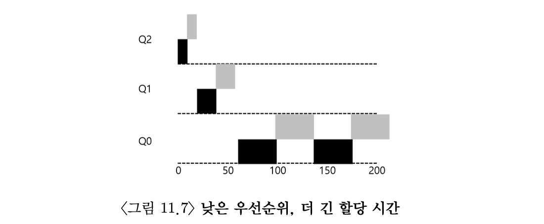 - 낮은 우선순위 큐 → 긴 타임 슬라이스 (CPU 집중형 작업에 적합).