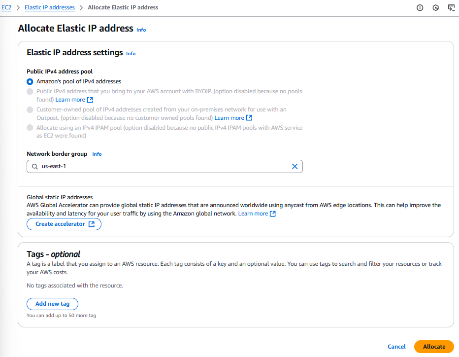 Allocate를 눌러 퍼블릭 IPv4주소를 임대할 수 있다.
