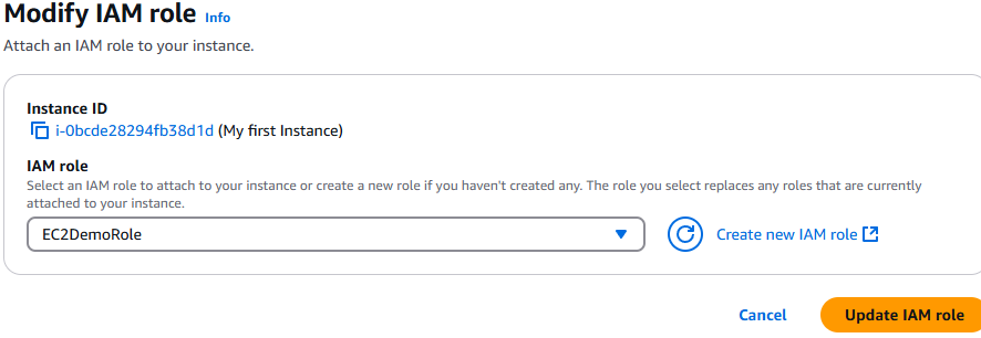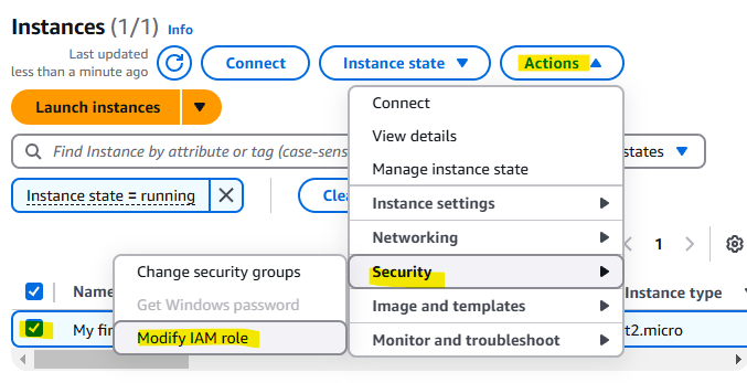 Instances > 원하는 인스턴스 선택 > Actions > Security > Modify IAM Role 선택