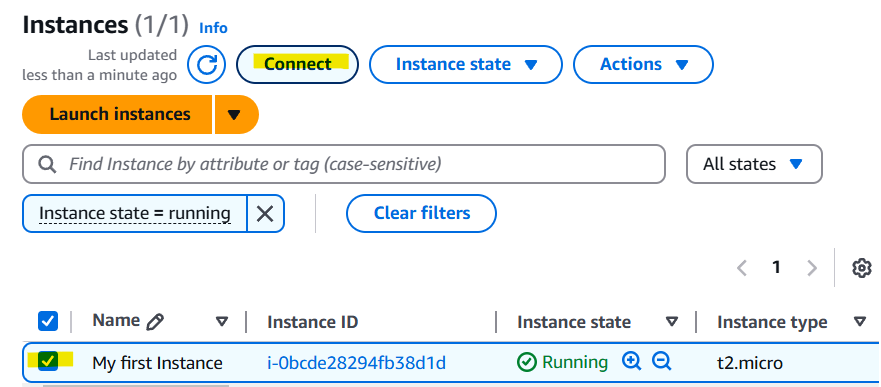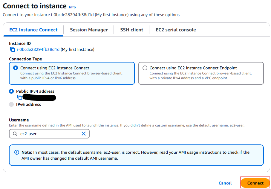 2. 그대로 두고 Connect를 누르면 바로 EC2 인스턴스로 접속 가능