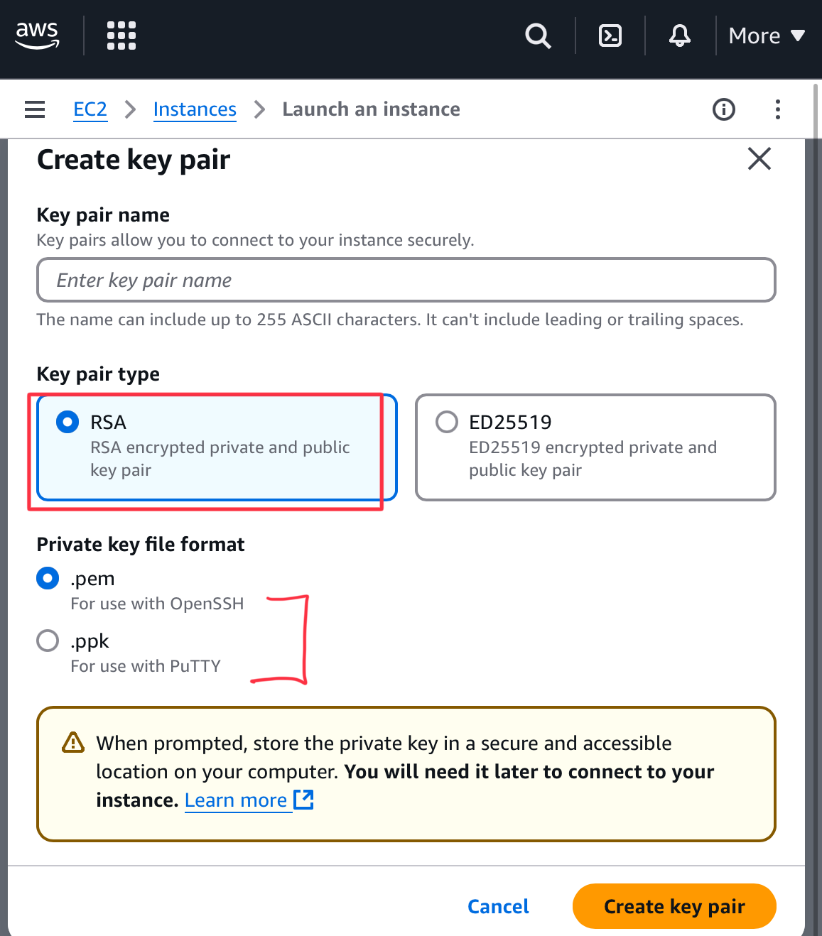 키페어의 이름을 입력하고 키페어타입은 RSA를 선택한다.
