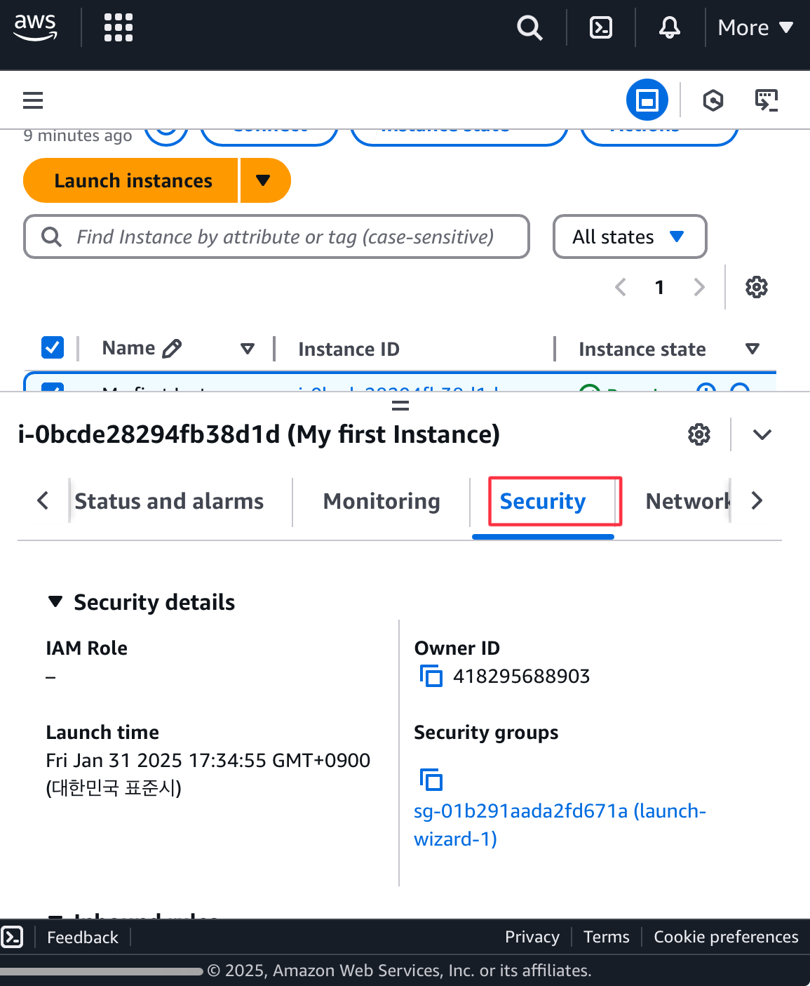 security를 선택하면 보안그룹에 대한 정보를 볼 수 있다.
