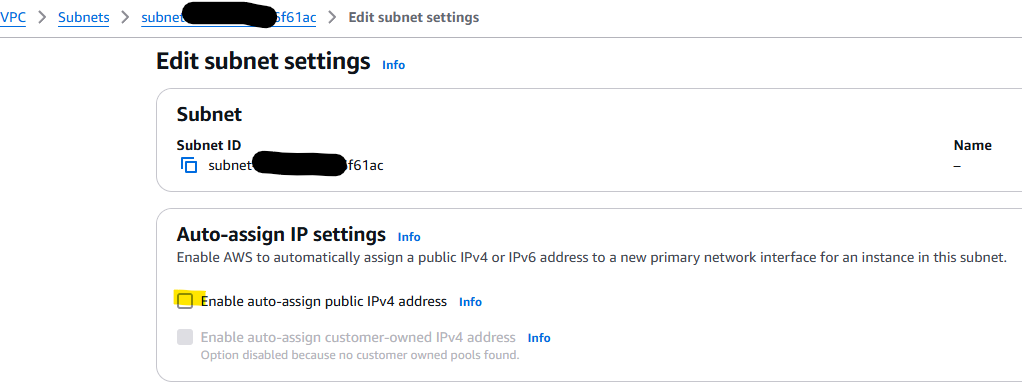 VPC > 서브넷 > 작업 > 서브넷 설정 편집에서 아래와 같이 체크해제한다.