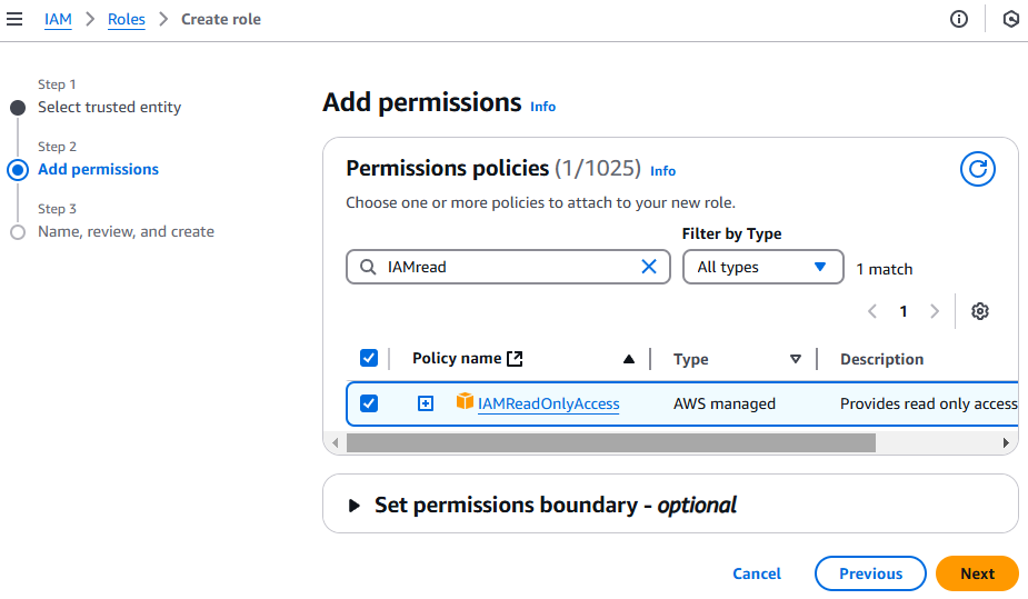 IAM > Roles > Create Role을 선택해 EC2에 IAMReadOnlyAccess권한을 부여한다.