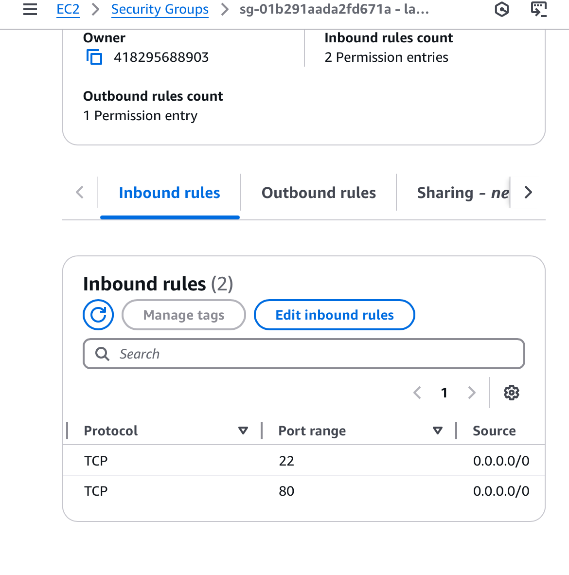 보안그룹을 클릭하면 인바운드 룰을 볼 수가 있는데, 확인해보면 현재 22번, 80번 포트는 누구나 접근할 수 있다.