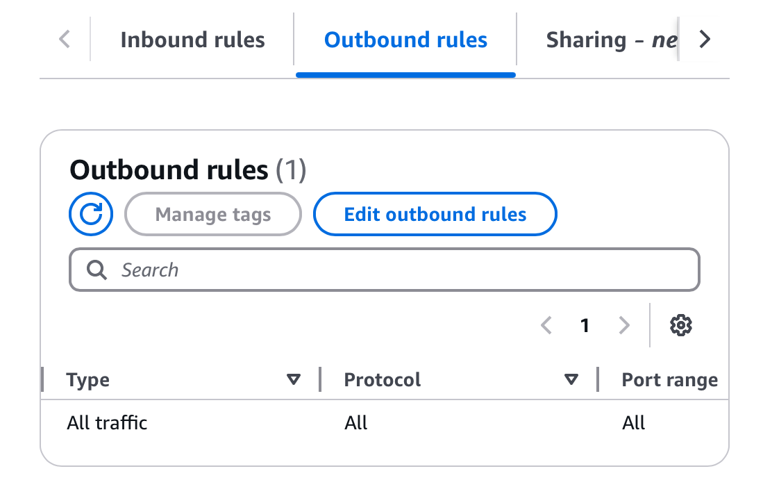 아웃바운드 룰을 보면 모든 아웃바운드 통신을 허용하고 있다. 이를 통해 인스턴스가 인터넷에 접근할 수 있게 된다.