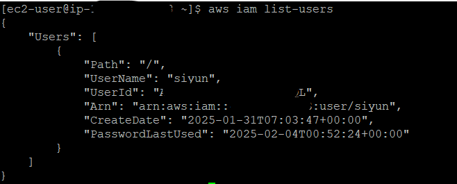 EC2인스턴스에 접속해 "aws iam list-users"를 입력하여 유저목록 확인
