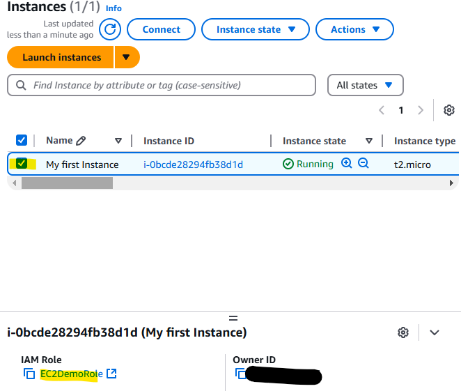다시 Instances > 원하는 인스턴스 선택 > Security 탭에서 IAM Role를 확인하면 적용한 Role로 업데이트 된 것을 확인