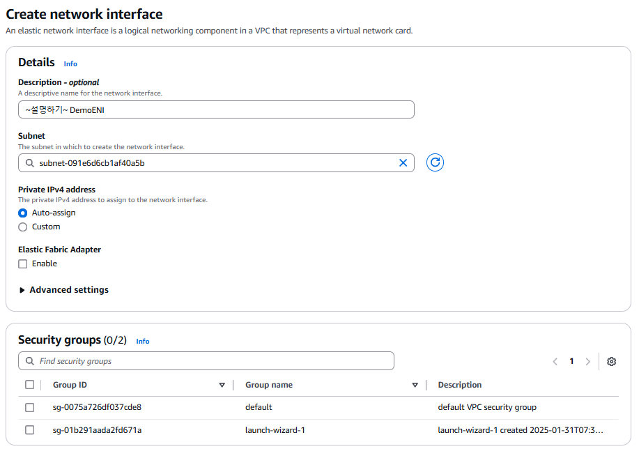 -> 즉, 인스턴스 생성 시 사설 및 공용 IP가 한 개씩 제공되는 ENI가 하나 생성되어 인스턴스와 연결됨.- ENI에 하나 이상의 보안 그룹을 연결할 수 있다.