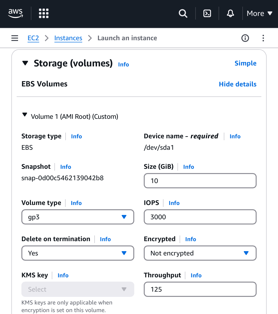 Advenced 를 선택하면 위 사진과 같이 세부적으로 설정할 수 있는데 Delete on termination 은 EC2인스턴스를 종료하면 그 볼륨도 삭제될 것이라는 것을 의미한다.