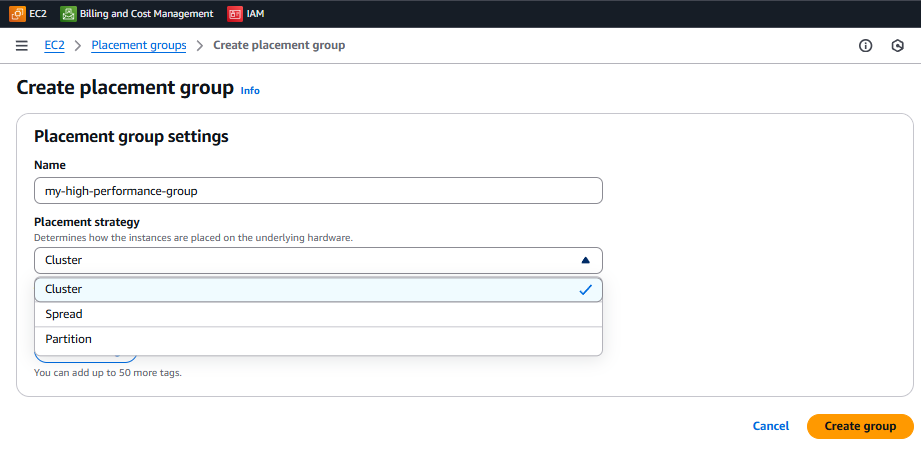 EC2 > Instances > Launch Instances 에서 스크롤을 내려 Advanced details > Placement group name에서 배치 그룹을 설정해줄 수 있다.