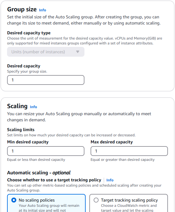 - ASG내 인스턴스의 최소 용량(개수), 희망 용량, 최대 용량 설정.