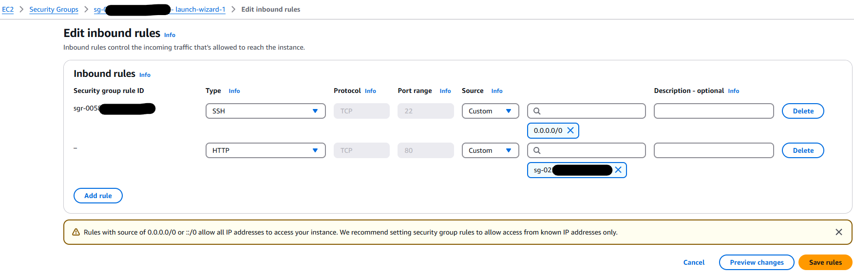 대상그룹 EC2인스턴스들에 적용된 보안그룹에서 기존 HTTP 접속 규칙을 삭제하고 새로 HTTP 규칙을 추가해 소스를 로드밸런서의 보안그룹으로 적용하면 된다.